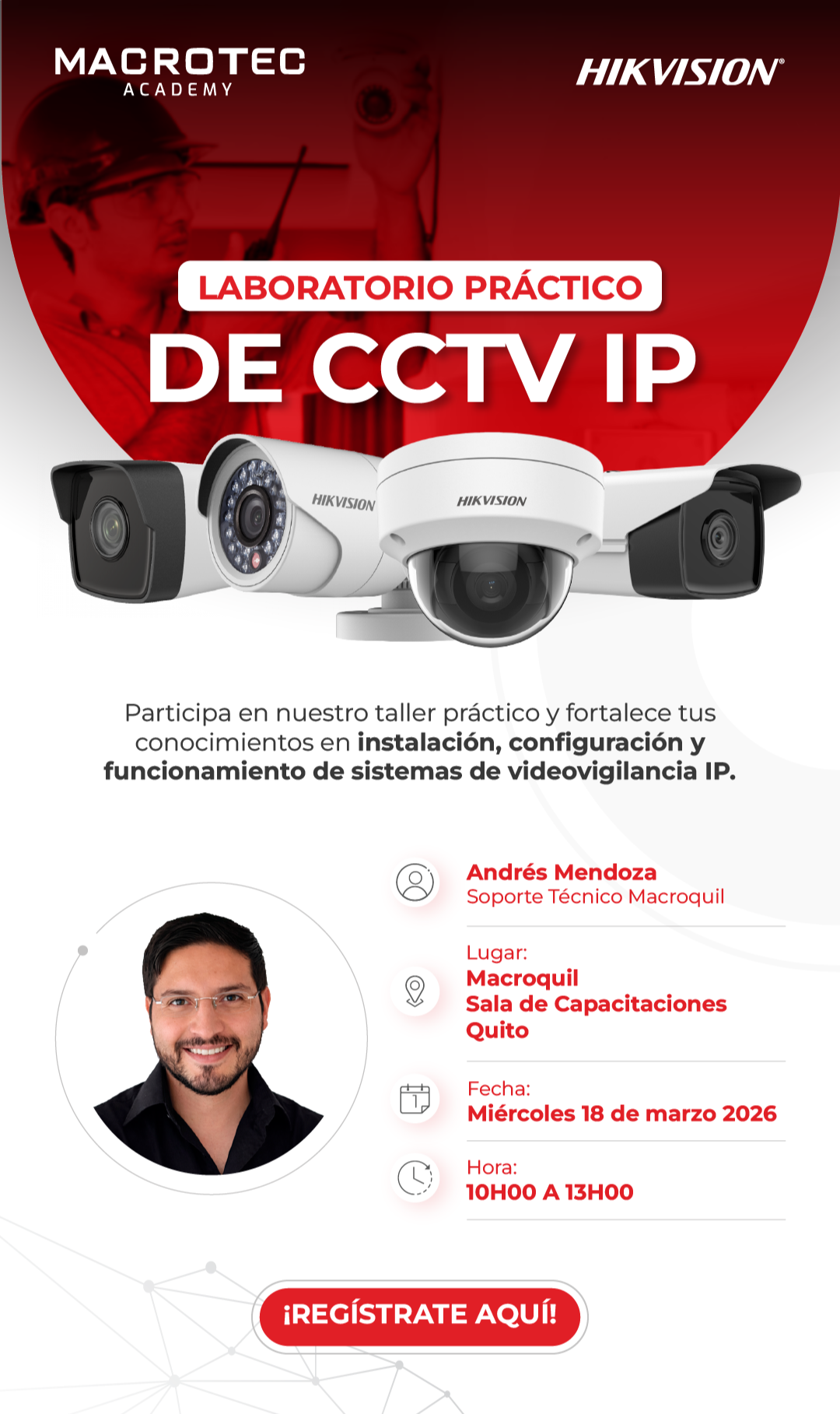 🔧 Laboratorio Práctico de CCTV IP – Hikvision Aprende de forma 100% práctica instalación, configuración y puesta en marcha de sistemas de videovigilancia IP junto a nuestros especialistas técnicos.